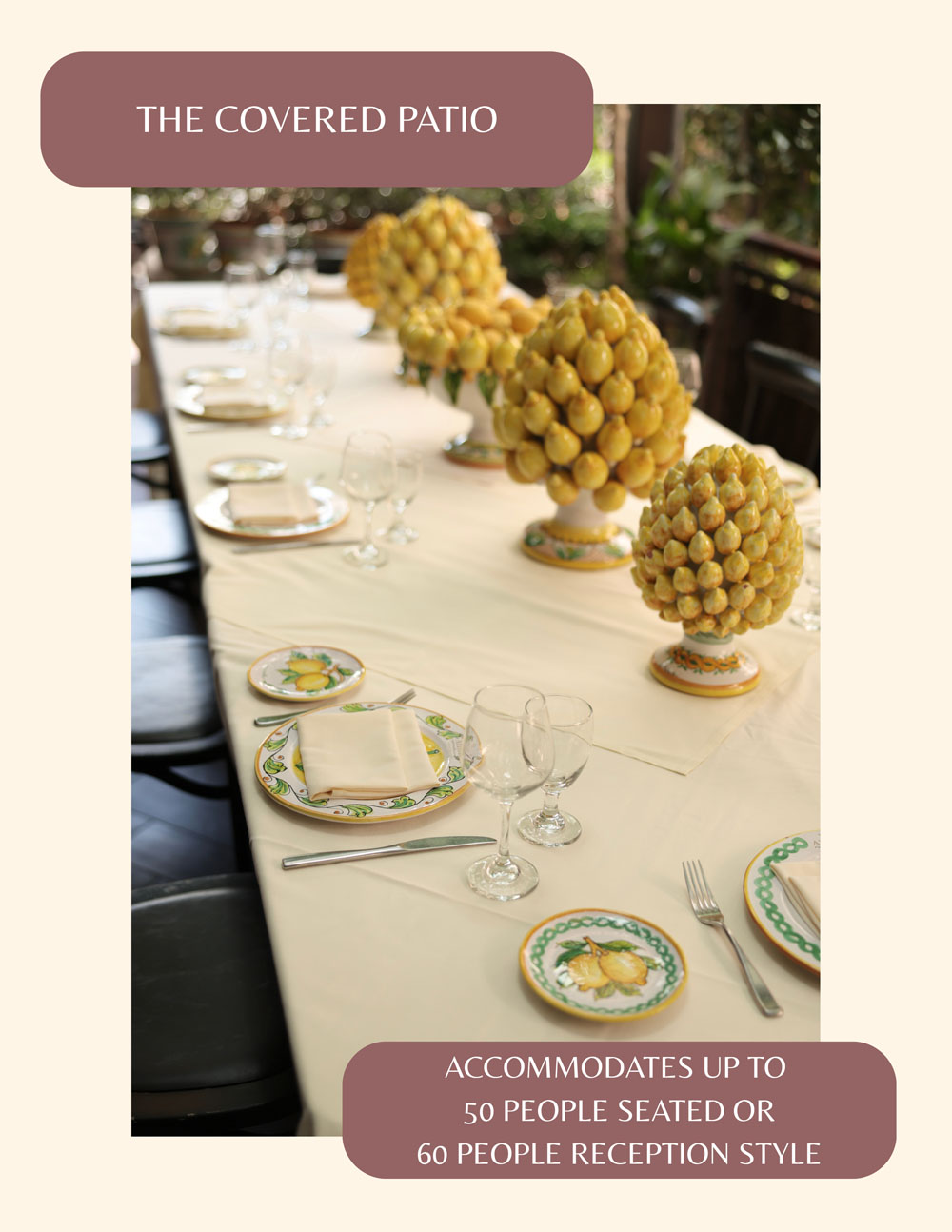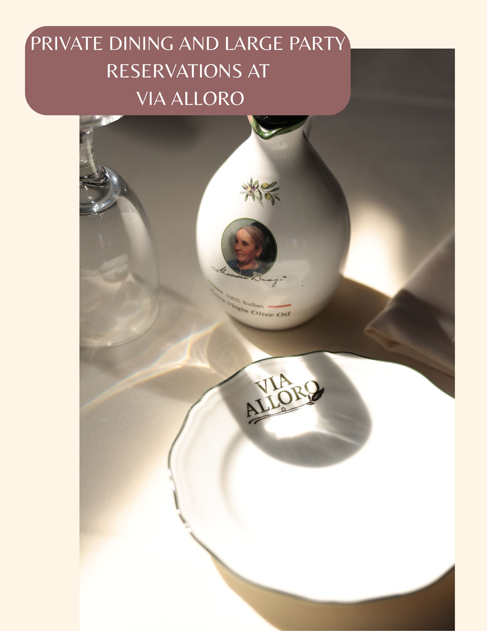 Whether you are looking to host a large dinner party or a smaller group for a special celebration we invite you to consider Via Alloro. We specialize in making all of your occasions unique and unforgettable. Business lunches or dinners, company and corporate functions, special celebrations, holiday parties and more. Choose from a key location inside the restaurant or choose to have your party in one of our private patios outside.